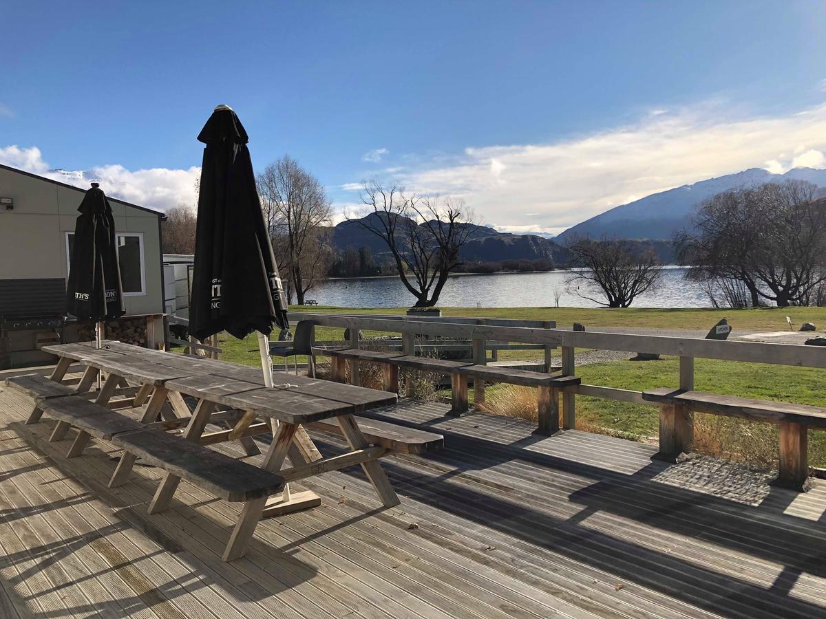 A large deck faces out towards the lake, with a BBQ and picnic tables.